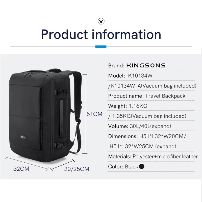 کولهپشتی Kingsons مدل وکیوم K10134 یک انتخاب عالی برای افرادی است که هم به استایل اهمیت میدهند و هم به کارایی. طراحی این کوله به شما این امکان را میدهد که حجم داخلی آن را با کمک قابلیت خلأ (Vacuum Compression) تا حد قابل توجهی فشرده کرده و وسایل بیشتری را در فضای کمتر جا دهید.